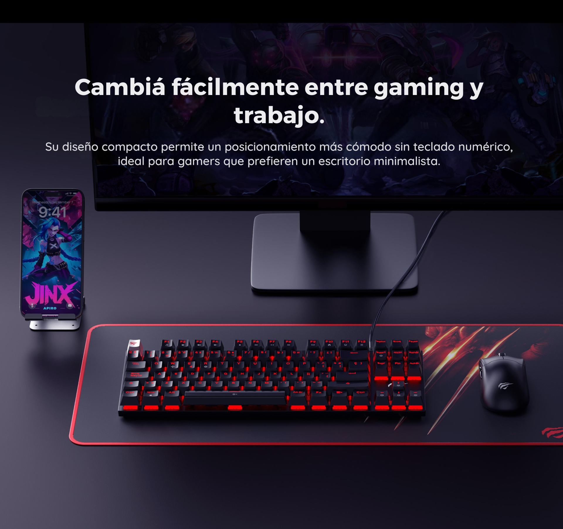 Gracias a su formato compacto, permite optimizar el espacio en el escritorio sin perder funcionalidad, siendo perfecto para setups minimalistas y mayor libertad de movimiento del mouse.